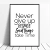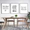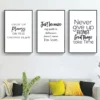 Cette affiche murale typographique propose une composition graphique élégante et contemporaine, entièrement dédiée à la mise en valeur de messages inspirants. Le visuel se présente sous forme de triptyques coordonnés, chaque affiche affichant une phrase courte en anglais, imprimée en noir sur un fond blanc uniforme. L’ensemble repose sur un contraste fort et maîtrisé, renforcé par des cadres noirs fins qui structurent visuellement le mur et donnent une lecture claire à chaque message.