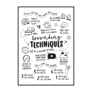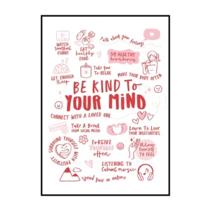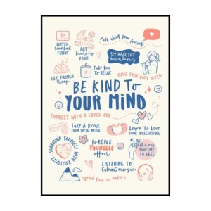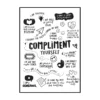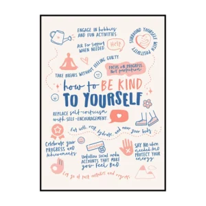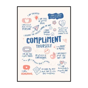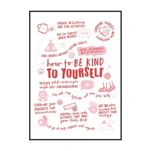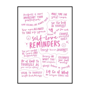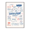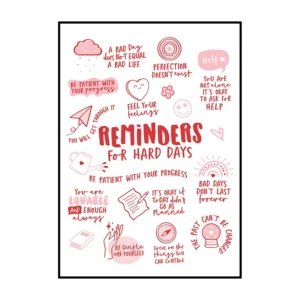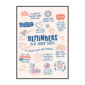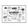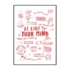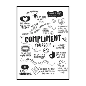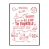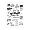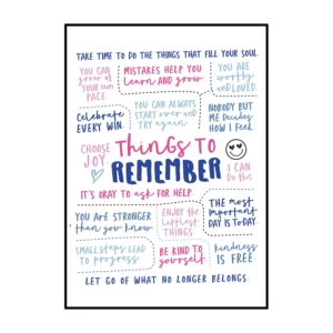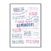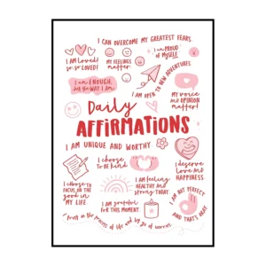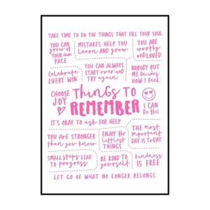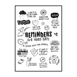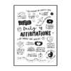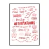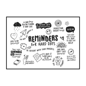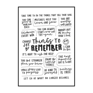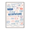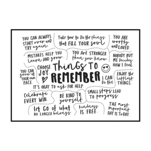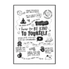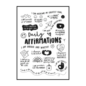 Cette affiche murale typographique met en avant une composition dense et expressive de messages positifs, présentés sous forme d’écritures manuscrites noires sur un fond blanc lumineux. Le visuel adopte une mise en page structurée en blocs de textes courts, séparés par des pointillés et des espaces réguliers, créant un rythme visuel équilibré et facile à lire. Les mots sont tracés avec une typographie volontairement irrégulière, évoquant l’écriture à la main, ce qui confère à l’ensemble une dimension authentique et chaleureuse.