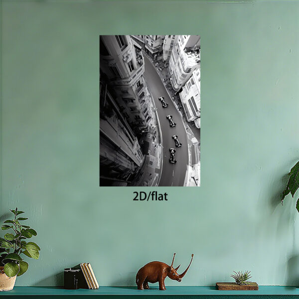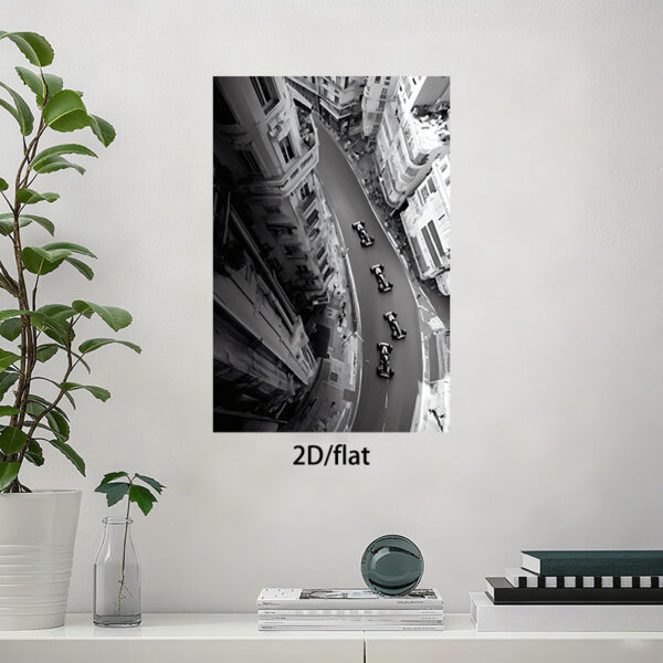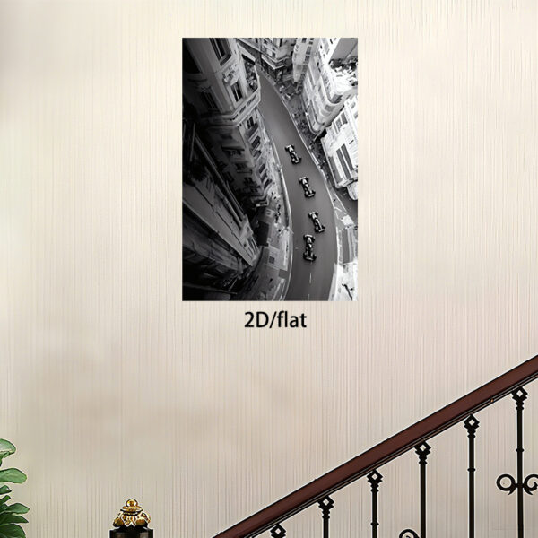 La composition verticale offre une perspective impressionnante sur les bolides qui filent entre les immeubles, créant un effet immersif et architectural. Imprimée en haute définition, cette décoration murale met en valeur chaque détail : courbes de la piste, contrastes profonds, lignes graphiques de la ville…