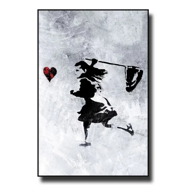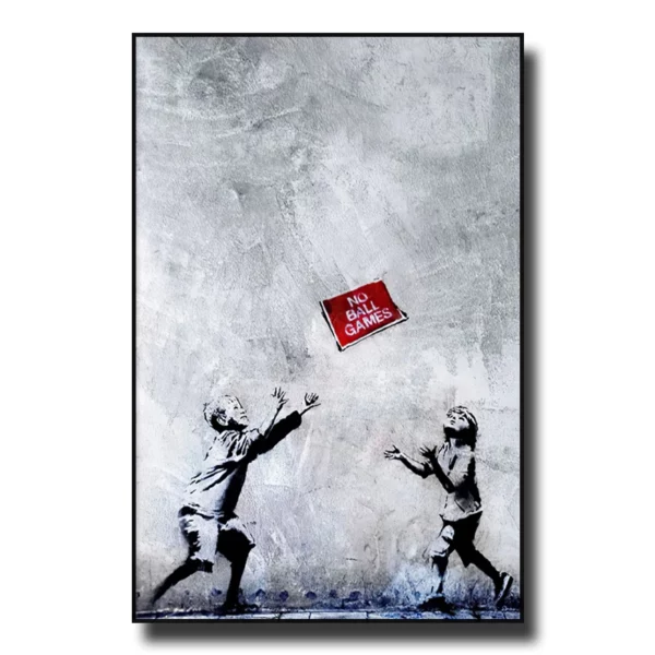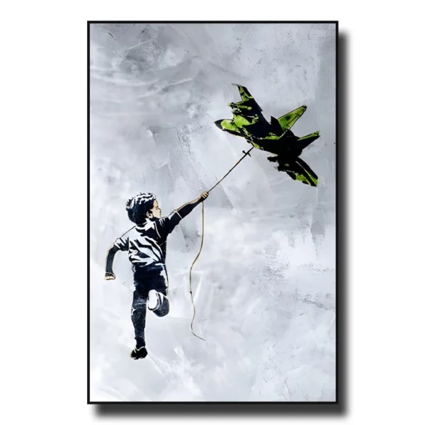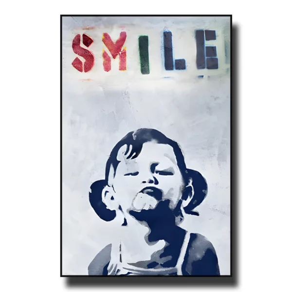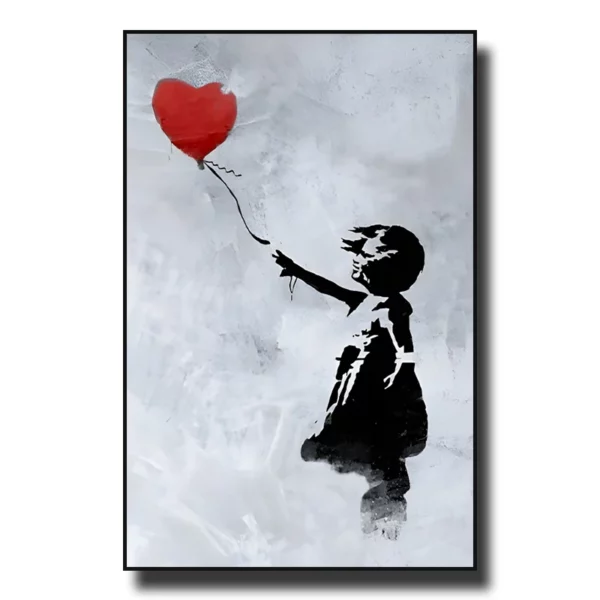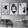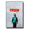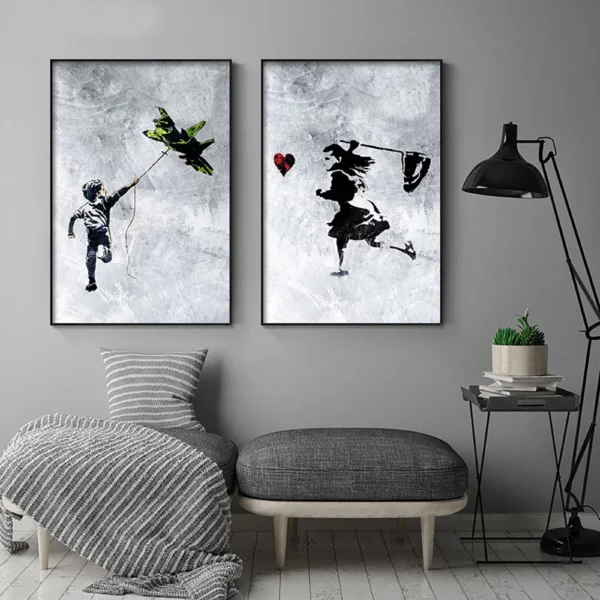 Chaque affiche met en valeur un design fort et reconnaissable, comme l’enfant au ballon rouge, le lanceur de fleurs ou encore les silhouettes enfantines qui symbolisent l’innocence face au monde moderne. Ces créations uniques insufflent un esprit rebelle et artistique dans votre salon, chambre ou bureau.