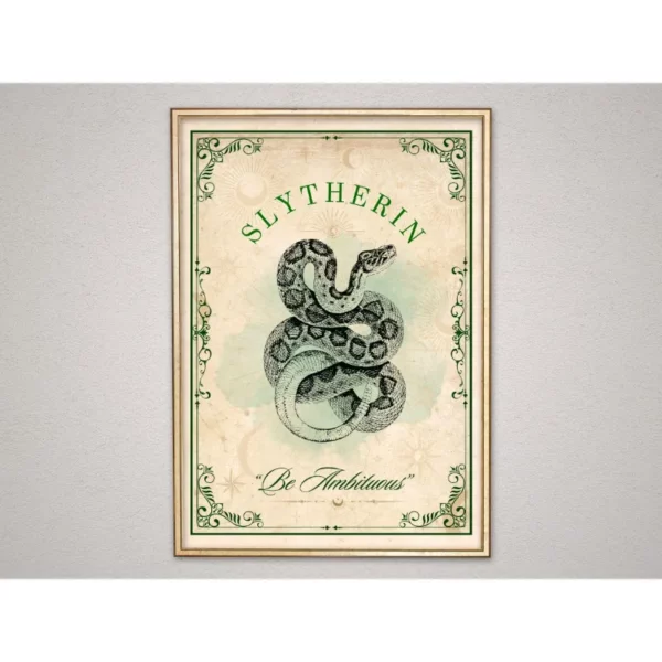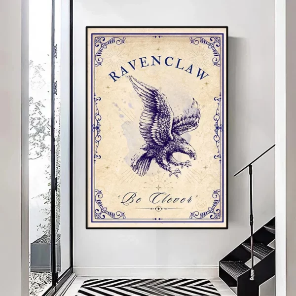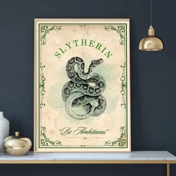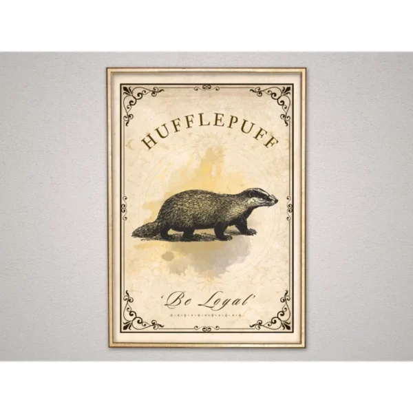 Chaque poster met à l’honneur l’animal symbolique de la maison – le lion courageux, le serpent ambitieux, l’aigle érudit et le blaireau loyal – accompagné de sa devise. Une manière idéale d’exprimer votre appartenance ou de créer une ambiance magique et chaleureuse dans votre salon, chambre ou bureau.