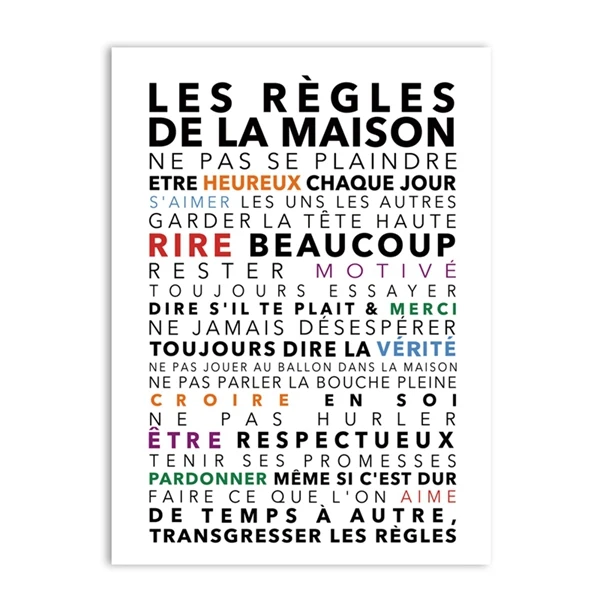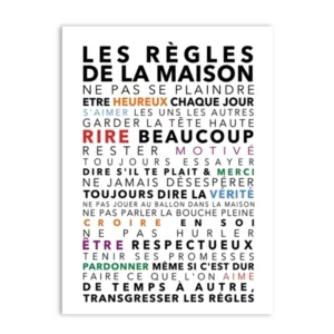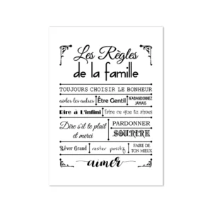 Apportez du sens et de la chaleur à votre intérieur avec cette affiche « Les règles de la famille », une décoration murale intemporelle qui met en avant les valeurs essentielles du quotidien : respect, bienveillance, amour et partage.