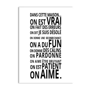 Pensée pour s’intégrer facilement dans un salon, une entrée, une cuisine ou une chambre, cette affiche typographique au design sobre et élégant devient un véritable repère visuel pour toute la famille. Elle rappelle, avec douceur et authenticité, ce qui compte vraiment à la maison : choisir le bonheur, rire ensemble, pardonner, rester positif et s’aimer.