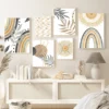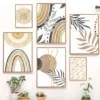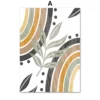 Cette affiche murale s’inscrit dans une esthétique contemporaine inspirée par la nature et l’abstraction graphique. La composition se présente comme une galerie murale harmonieuse, réunissant plusieurs visuels coordonnés aux formes organiques et aux lignes structurées. Les illustrations associent feuillages stylisés, arcs arrondis, motifs solaires et éléments graphiques ponctués de lignes et de points, créant un ensemble équilibré et visuellement cohérent.