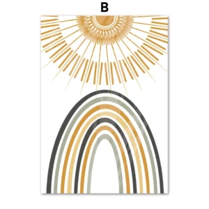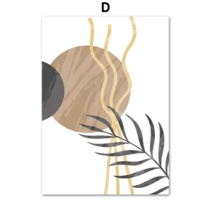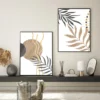 La palette de couleurs privilégie des tons naturels et chaleureux. Les nuances de beige, sable, ocre, vert doux, gris et noir apportent une profondeur subtile sans jamais alourdir l’espace. Les contrastes restent maîtrisés, laissant respirer chaque affiche déco tout en renforçant l’unité d’ensemble. Les formes végétales, volontairement stylisées, dialoguent avec des motifs abstraits comme des arcs, des cercles et des lignes rayonnantes, donnant à ce poster déco une identité graphique affirmée et actuelle.