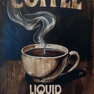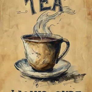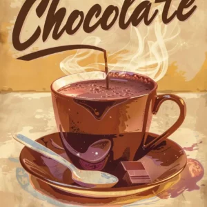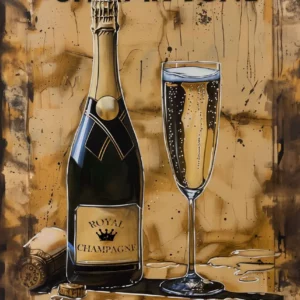 Les couleurs sont profondes et élégantes, dominées par des tons bruns, ambrés, noirs et dorés, ponctués de touches plus lumineuses comme le rouge du vin ou le jaune du champagne. Les fonds texturés rappellent des affiches anciennes, légèrement patinées par le temps, renforçant le caractère rétro de ce poster déco. Les illustrations sont expressives sans être surchargées, mettant en valeur les verres, les tasses et les bouteilles avec un sens du détail maîtrisé. L’ensemble crée une ambiance feutrée, presque intimiste, idéale pour une décoration intérieure de caractère.