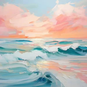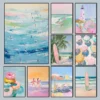 Cette affiche murale propose une immersion lumineuse dans un univers estival inspiré du bord de mer, décliné sous la forme d’une galerie murale riche et harmonieuse. Le visuel rassemble plusieurs scènes côtières traitées dans un style pictural expressif, où les couleurs douces et pastel occupent une place centrale. Les nuances de bleu, turquoise, rose, sable et jaune composent une palette fraîche et ensoleillée, immédiatement évocatrice de vacances, de détente et de liberté.