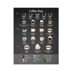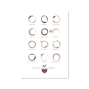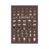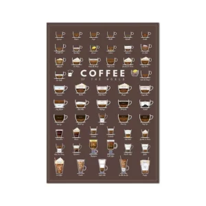 Cette affiche murale consacrée à la culture du café propose une approche à la fois graphique, pédagogique et décorative, idéale pour enrichir une décoration intérieure contemporaine. Le visuel se compose de plusieurs illustrations autour de l’univers du café, organisées en une composition harmonieuse et équilibrée. On y retrouve des représentations de différentes boissons, des vues de tasses de café vues du dessus ainsi que des mains tenant une tasse, le tout décliné dans une palette de tons bruns, beiges et crèmes. L’ensemble crée une atmosphère douce, chaleureuse et immédiatement identifiable.