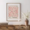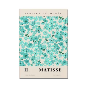 Cette affiche murale présente un motif floral dense occupant un large carré central, composé d’une multitude de formes végétales stylisées. Les fleurs et feuillages sont répartis de manière régulière sur toute la surface, sans point focal unique, créant un ensemble homogène et structuré. Le motif est encadré par une marge claire qui met en valeur la composition centrale. En partie haute et basse, des éléments typographiques sobres sont visibles, disposés de façon alignée et symétrique, contribuant à l’équilibre visuel de l’affiche. L’ensemble relève d’une illustration décorative inspirée du découpage graphique, avec une lecture immédiate et lisible.