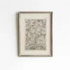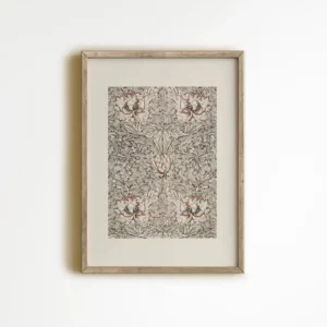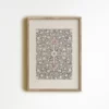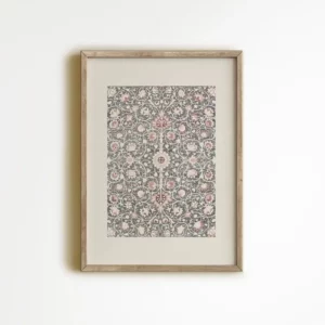 Affiche murale motifs floraux ornementaux aux tons beiges et roséCette affiche murale présente une composition florale dense organisée en motif ornemental. Le visuel est construit autour d’un décor végétal stylisé, composé de feuillages, de fleurs et de formes symétriques qui occupent l’ensemble de la surface. Le dessin est fin, détaillé, avec une répétition régulière des éléments qui crée un équilibre visuel net. L’ensemble s’apparente à une illustration décorative à mi-chemin entre motif textile et composition murale, sans élément central isolé, mais avec une lecture homogène sur toute la surface de l’affiche.