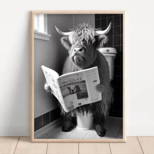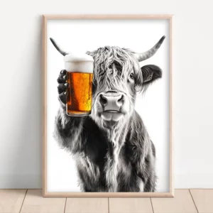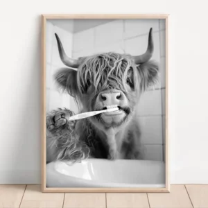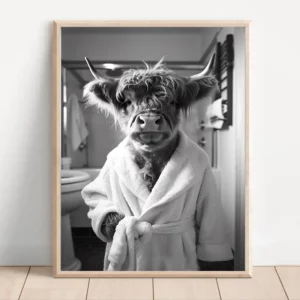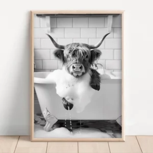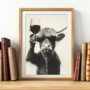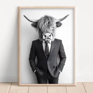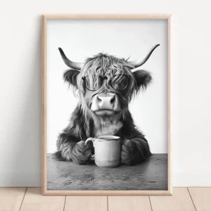 Cette affiche murale met en scène une vache Highland photographiée en noir et blanc, dans une approche à la fois minimaliste et résolument contemporaine. Le contraste est net, maîtrisé, et donne immédiatement de la présence à l’image sans jamais surcharger l’espace. Le regard est attiré par l’attitude de l’animal, expressif et légèrement décalé, qui apporte une touche d’humour subtil tout en conservant une vraie élégance visuelle. On est loin de la simple image décorative : cette affiche design raconte une scène, installe une ambiance et crée un point focal fort sur le mur.