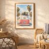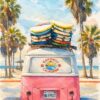 Cette affiche murale représente l’arrière d’un van vintage rose stationné face à une plage bordée de palmiers sous un ciel bleu lumineux. Sur le toit du véhicule, une pile de planches de surf colorées évoque immédiatement l’univers du surf et des journées ensoleillées au bord de l’océan. L’illustration adopte un style aquarelle doux et texturé qui donne à l’image une atmosphère chaleureuse et estivale. La composition est centrée sur le van, placé au premier plan, tandis que l’horizon marin et les palmiers encadrent la scène et renforcent la sensation de voyage et de liberté.