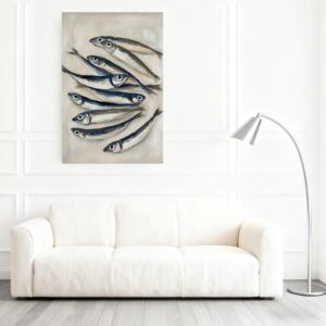 Apportez une touche élégante et marine à votre intérieur avec cette affiche artistique représentant un banc de poissons bleu-gris, peints dans un style texturé et contemporain. Cette illustration raffinée joue sur les nuances naturelles et les coups de pinceau expressifs pour créer une ambiance apaisante, moderne et pleine de caractère.