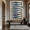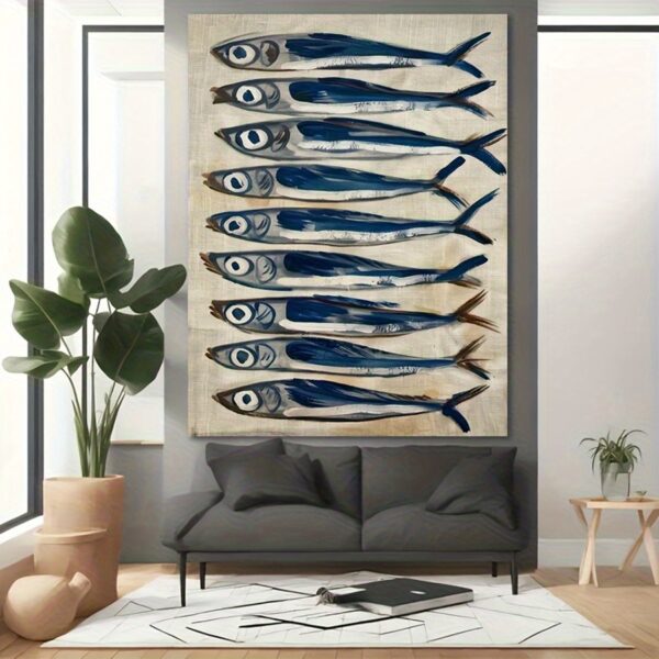 Apportez une touche artistique et marine à votre intérieur avec cette superbe affiche de poissons bleus alignés, réalisée dans un style graphique contemporain. Ses couleurs profondes, ses formes stylisées et son rendu texturé en font une pièce décorative unique, parfaite pour donner du caractère à un salon, une cuisine, une entrée ou une maison de bord de mer.