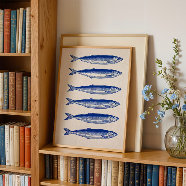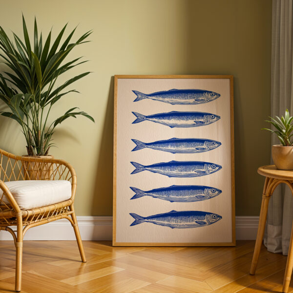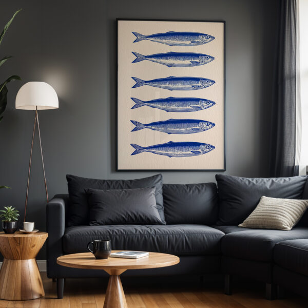 Affiche Sardines Bleues – Illustration Murale Style Gravure pour Cuisine & Décoration Bord de Mer