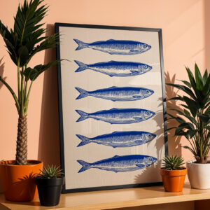 Apportez une touche graphique et pleine de caractère à votre intérieur avec cette affiche de sardines bleues au style gravure, idéale pour une décoration bord de mer, une cuisine moderne ou un espace inspiré par l’univers marin. Le contraste du bleu profond sur fond clair crée un visuel élégant et intemporel, mettant en valeur six sardines stylisées aux lignes fines et détaillées.
