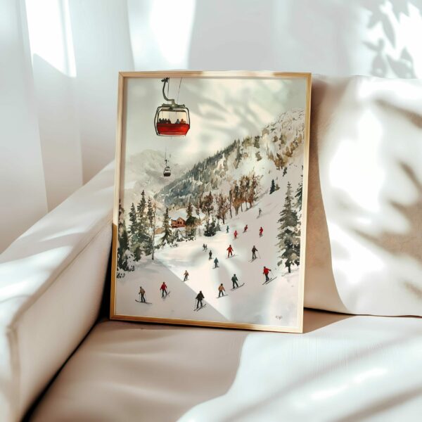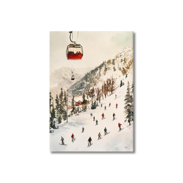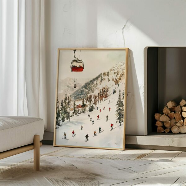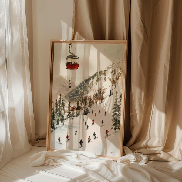Idéale pour une décoration cosy, alpine ou inspirée de l’hiver, cette illustration s’intègre parfaitement dans un salon, une chambre, un couloir ou une maison de vacances. Les couleurs douces, les reliefs naturels et la lumière hivernale créent une ambiance apaisante et élégante, parfaite pour tous les amateurs de montagne et de sports d’hiver.