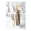 Une paire de skis vintage appuyée contre un poteau dans un paysage enneigé.