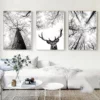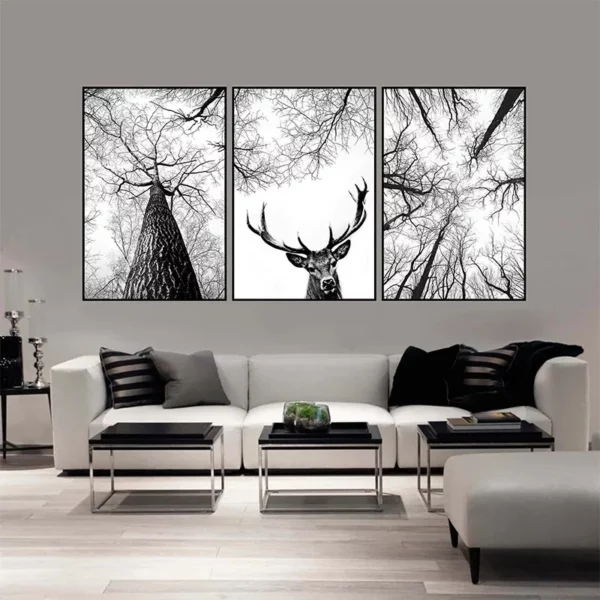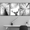 Triptyque Cerf & Forêt Noir et Blanc – Affiches Nature Modernes pour Décoration Murale