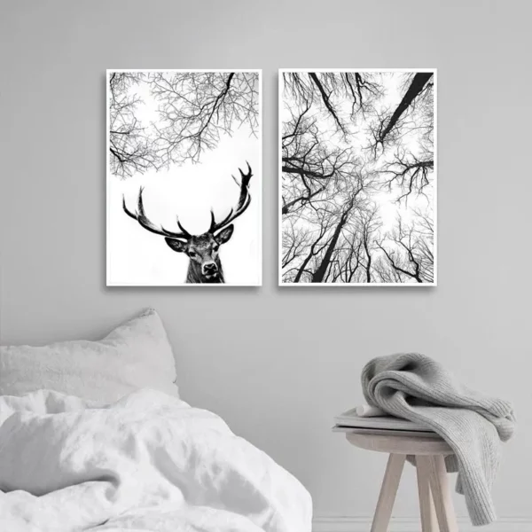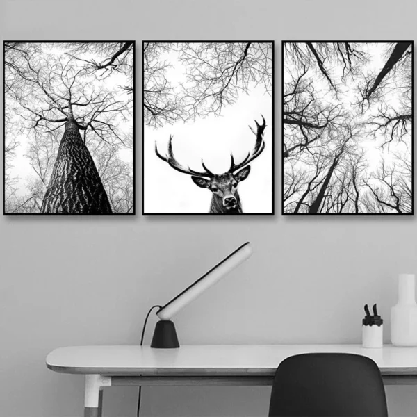 Offrez une touche élégante et contemporaine à votre intérieur avec ce triptyque noir et blanc représentant un cerf majestueux entouré de forêts vues en contre-plongée. Ces affiches minimalistes et graphiques transforment instantanément une pièce en un espace apaisant, moderne et inspiré par la nature.