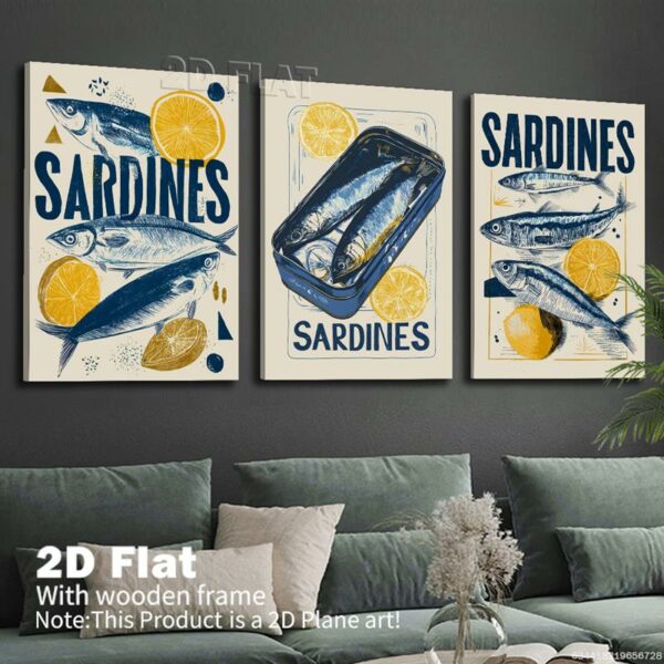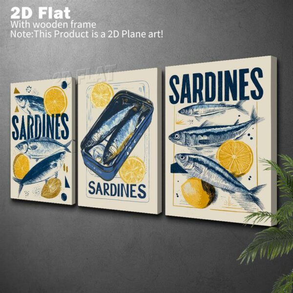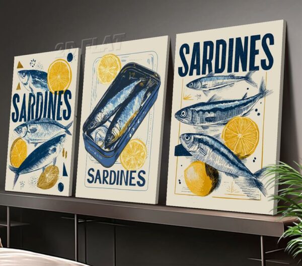Apportez une ambiance fraîche, méditerranéenne et pleine de caractère à votre cuisine avec ce triptyque décoratif de sardines, inspiré des affiches vintage et des packagings traditionnels. Composé de trois illustrations complémentaires — sardines entières, boîte de sardines et citrons jaunes — ce set mural crée un véritable univers graphique à la fois moderne, rétro et ensoleillé.