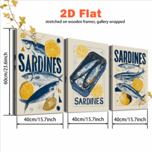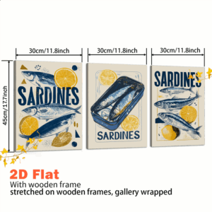 Apportez une ambiance fraîche, méditerranéenne et pleine de caractère à votre cuisine avec ce triptyque décoratif de sardines, inspiré des affiches vintage et des packagings traditionnels. Composé de trois illustrations complémentaires — sardines entières, boîte de sardines et citrons jaunes — ce set mural crée un véritable univers graphique à la fois moderne, rétro et ensoleillé.